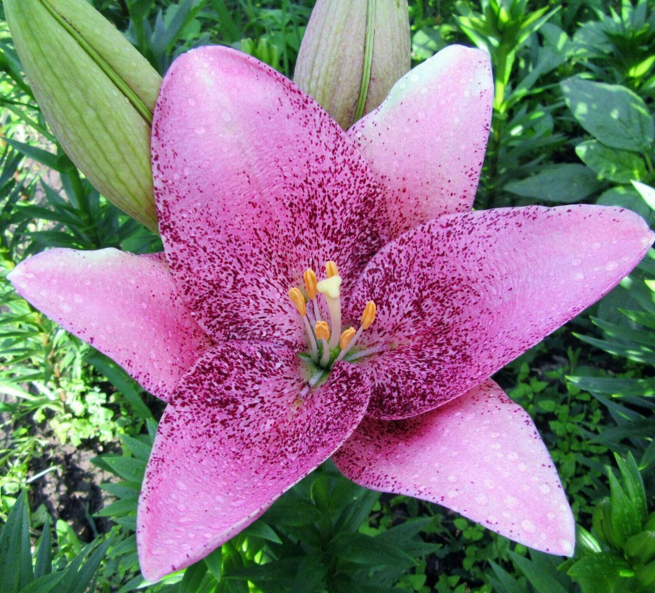 Лилия Свит Шугар цветы сиреневато-розовые с темным крапом, цветы диаметром 20-23см.