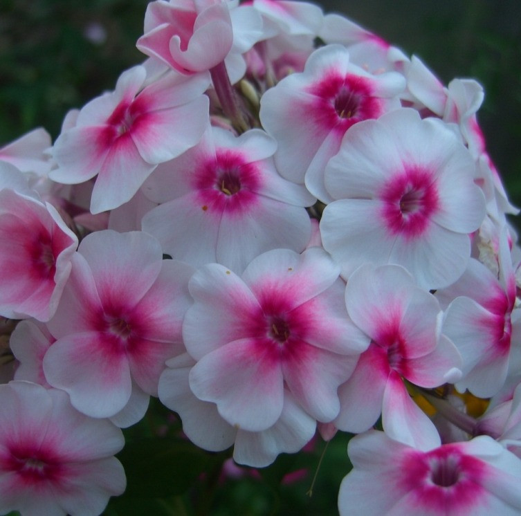 Бело-розовой окраски, лепестки круглые, в центре малиново-карминовый глазок, диаметр цветкка 3см. Соцветие большое, широко-пирамидальное, плотное. Куст прочный, густой, высокий от 80см и выше. Зимостойкий, устойчивый к грибным болезням сорт. Информации об авторстве нет.