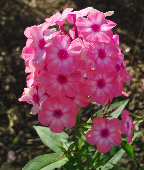 Флокс Оленька. Нежно-светло-розовый с большим белым центром и ярким карминным колечком. Не выгорает на солнце. Цветок колесовидной формы. Соцветие округло-коническое, среднего размера, довольно плотное. Куст прямостоячий, прочный, хорошо облиственный, быстро разрастается. Легко размножается. Зимостойкий.