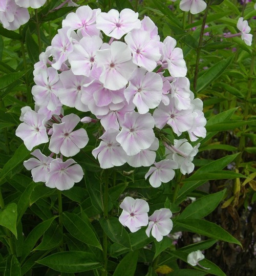 Цветок блюдцевидный, белый, очень крупный (4 см) с пурпурными тенями, к центру тени гуще, не выгорает. Соцветие округло-коническое, плотное, большое. Сорт создает ощущение воздушности благодаря светящейся, перламутровой окраске.