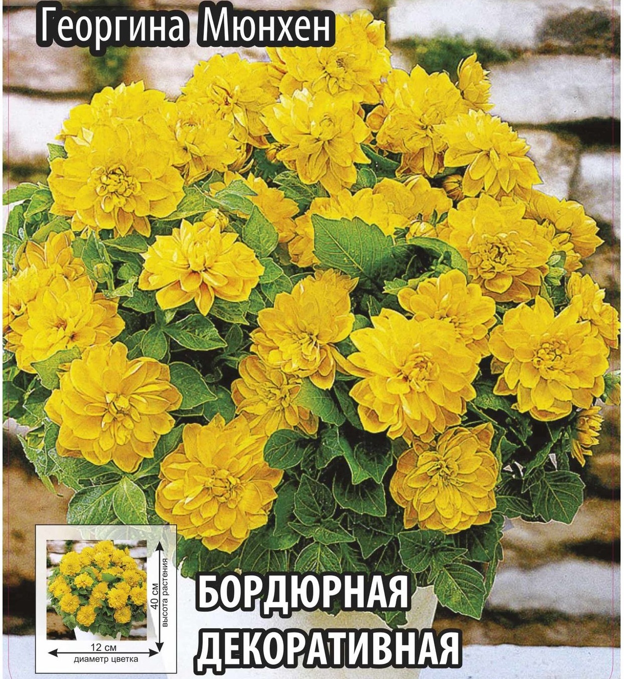Георгина бордюрная MUNCHEN - имеет небольшую высоту, до 50 см, благодаря чему может быть прекрасно использована в бордюрных посадках. Подходит для выращивания в контейнерах и вазонах, при использовании в групповых посадках лучше всего размещать в средней части цветника. Цвет георгины - яркий желтый.