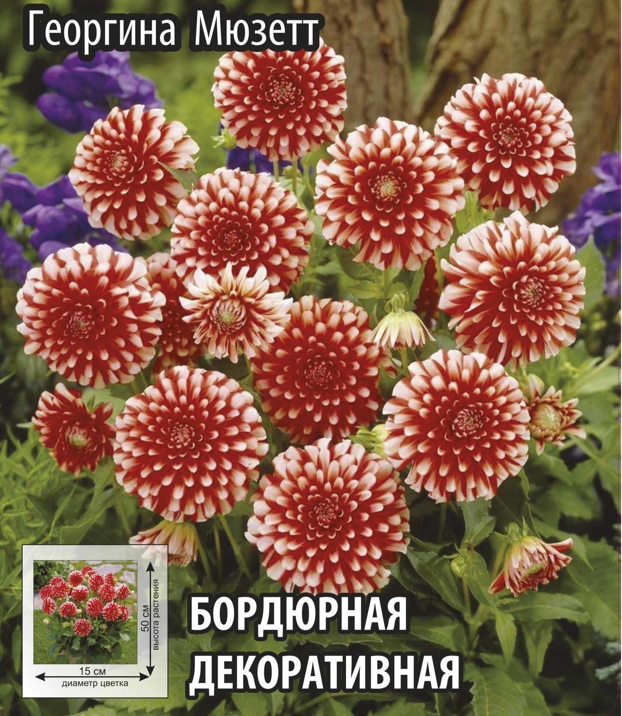 Георгина бордюрная MUSETTE - имеет небольшую высоту, до 50 см, благодаря чему может быть прекрасно использована в бордюрных посадках. Подходит для выращивания в контейнерах и вазонах, при использовании в групповых посадках лучше всего размещать в средней части цветника. Цвет георгины - красный с белыми кончиками цветочков.