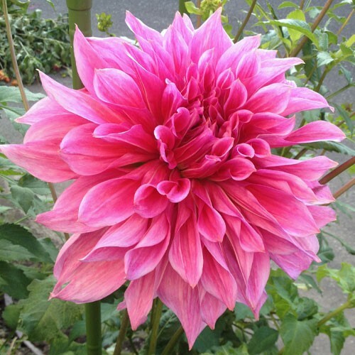 Георгина Маки. Декоративных георгин серии Макси. Цветок махровый, розовый с перламутровым отливом, диаметром 20 см. Лепестки плоские, широкие, заостренные на концах. Куст мощный, пышный, стебли полые высотой до 100 см. Листья перистые, тёмно-зеленые, многочисленные. Цветет обильно и продолжительно с июля по сентябрь. Предпочитает солнечные, защищенные от ветра места, плодородные хорошо дренированные почвы. Используется для групповых посадок и на срезку. Не требует дополнительных опор. Устойчива к неблагоприятным условиям, к болезням и вредителям. На зиму клубни выкапывают и хранят в погребах, подвалах при температуре 3-6 градусов и относительной влажности 50-60 %. Георгины размножают делением клубней.