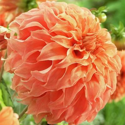 Декоративных георгин серии Макси. Цветок махровый, кораллово-лососевый, диаметром 25 см. Лепестки плоские, широкие, заостренные на концах. Куст мощный, пышный, стебли полые высотой до 120 см. Листья перистые, тёмно-зеленые, многочисленные. Цветет обильно и продолжительно с июля по сентябрь. Предпочитает солнечные, защищенные от ветра места, плодородные хорошо дренированные почвы. Используется для групповых посадок и на срезку. Не требует дополнительных опор. Устойчива к неблагоприятным условиям, к болезням и вредителям. На зиму клубни выкапывают и хранят в погребах, подвалах при температуре 3-6 градусов и относительной влажности 50-60 %. Георгины размножают делением клубней.