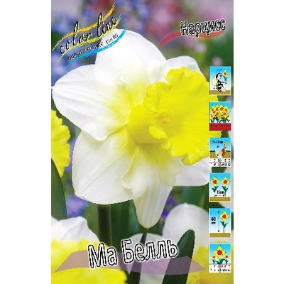 (крупнокоронч.) белая, коронка лимонно-желтая, у основания коронки на околоцветнике желтое пятно, очень крупный нарцисс