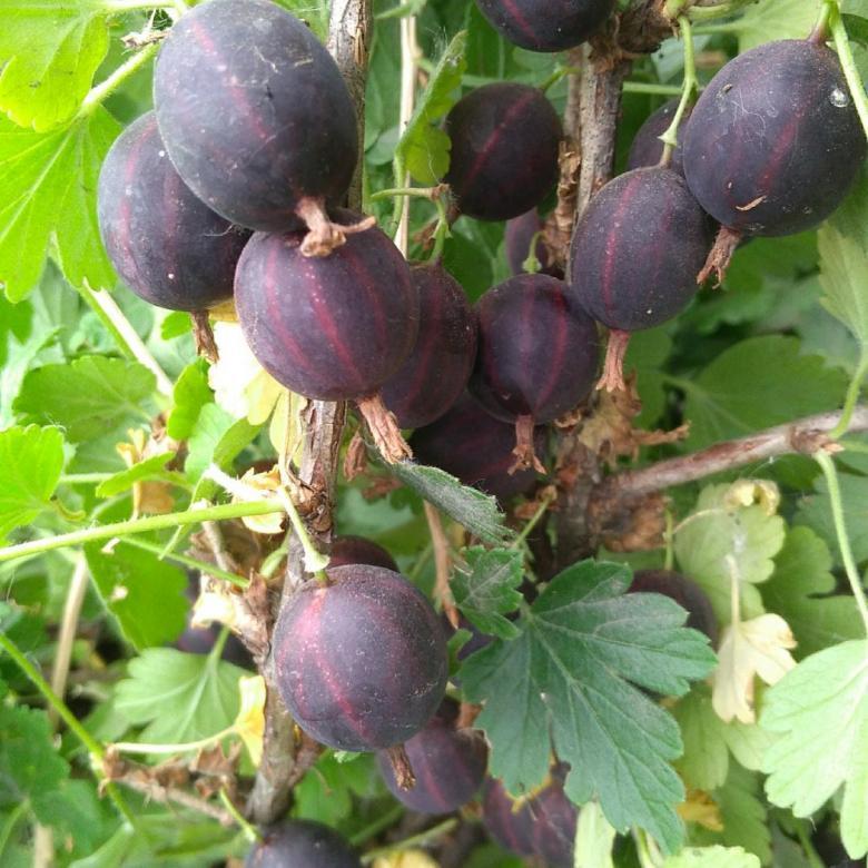 Среднеспелый крыжовник Куйбышевский. Ягоды до 8 г, темно-вишневые, почти черные, сладкие и ароматные, десертные. Слабошиповатый.