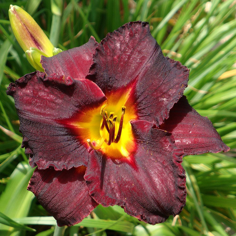 Лилейник Black Stockings Тёмно-бордовый, почти чёрный цветок с гофрированной каймой и узким жёлтым горлом. Полувечнозелёный тетраплоид. Повторное цветение.