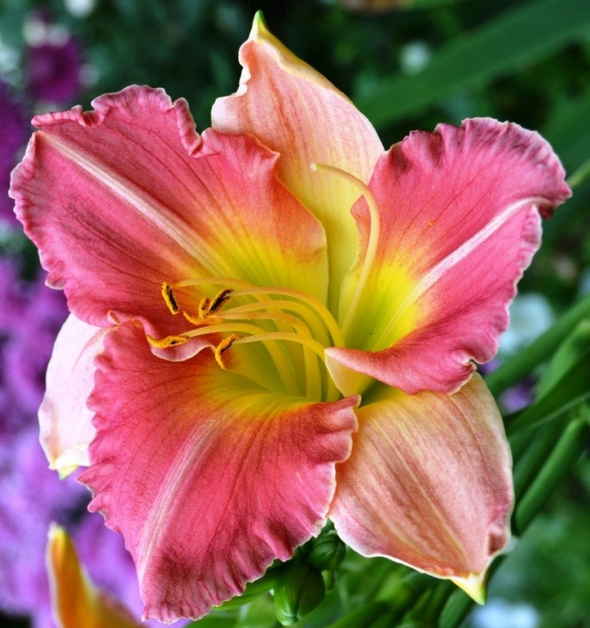 двуцветный: ярко-розовый и бледно-розовый, горло желтое / Н 80см, Ø 12см, цветение: 8-9