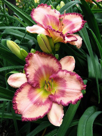 ГОФРИР. Палево-розовый с желтым центром, темно-розовым пятном и темно-розовой тонкой каймой / Н 45см, Ø 13см, цветение: 7-8,9