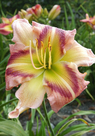 палево-розовый с лилово-розовым кольцом и желтым горлом, Н-55 cm 15 cm , июль-август, более 400 цветков за сезон у трехлетнего растения
