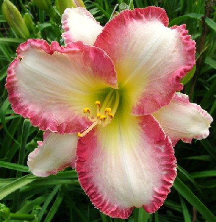 желтое горло, розовато-кремовый центр, ярко-розовая кайма, легкое гофре / Н 70см, Ø 13см, цветение: 7-8