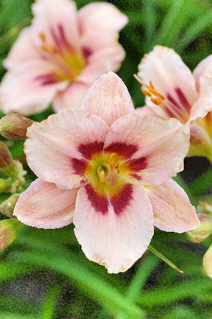 ГОФРИР, нежно-розовый с вишнево-розовым кольцом и зеленоватым горлом, Н-55 cm , Ø13 cm, 7, более 250 цветков за сезон на трехлетнем растении