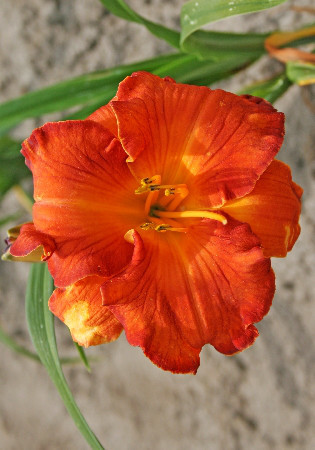 ярко-оранжевый с красноватым румянцем и желтым горлом, кайма слегка гофрированная, красноватая, Н-70см, Ø!5см, 6-7,8