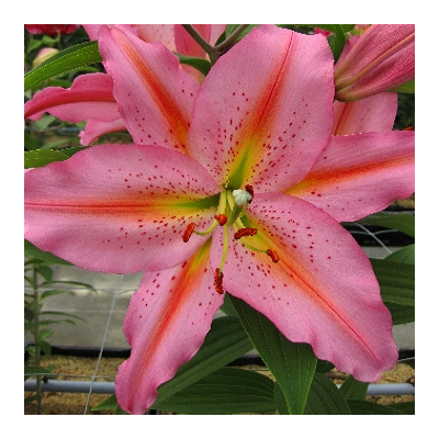 Лилия ЦИРКУС розовый с тёмно-розовым крапом, жёлто-зелёным центром и оранжевыми полосами вдоль лепестков, 22см
