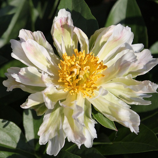 Полумахровый очень живописный, белый с светло-зелёноватым перистым рисунком и розовым мазком по краю лепестка, центр цветка -жёлтый