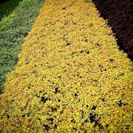 Спирея японская Голден Карпет (Spiraea japonica Golden Carpet) - карликовый кустарник с округлой формой кроны высотой всего 30-40 см и такого же диаметра. Листочки маленькие, овальной формы, золотисто-желтого цвета, длиной 2см. Побеги стелющиеся, расположены плотно. Цветов очень мало, представляют собой маленькие розовые цветочки расположены в щитковидных соцветиях, появляются на кусте с июня по сентябрь. Цветы распускаются на 3-4 дня.
