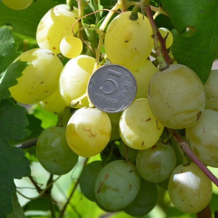 Виноград Белое чудо Очень раннего срока созревания - 105-110 дней. Морозостойкость -25°С. Грозди очень крупные, 600-900 г, отдельные до 1,5 кг, цилиндро-конические, средней плотности. Ягоды крупные, 24 x 20 мм, массой 6-8 г, овальные, белые. Вкус гармоничный. Мякоть мясисто-сочная. Сахаристость 18-19 г/100 см3 , кислотность 6-7 г/л. Побеги вызревают хорошо. Высокоустойчив к милдью, устойчив к оидиуму и серой гнили. Транспортабельность хорошая.