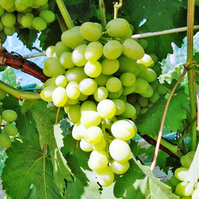 Галахад (Талисман х Восторг) х Восторг Мускатный). Очень ранний- 95-100 дней. Сильнорослый. Цветок обоеполый. Грозди цилиндроконической формы, средней плотности весом 500-800 грамм (до 1,2 кг). Ягоды белые, с загаром, овальной формы, весом 10-12 грамм. Вкус гармоничный. Мякоть мясистая, кожица съедаемая. Сахаронакопление очень высокое. Не растрескиваются. Хорошо сохраняются на кустах после созревания. Вызревание побегов очень хорошее. Морозоустойчивость до -25 °С. Обрезка на плодоношение на 4-6 глазков. Устойчивость к основным болезням очень высокая. Транспортабельный.
