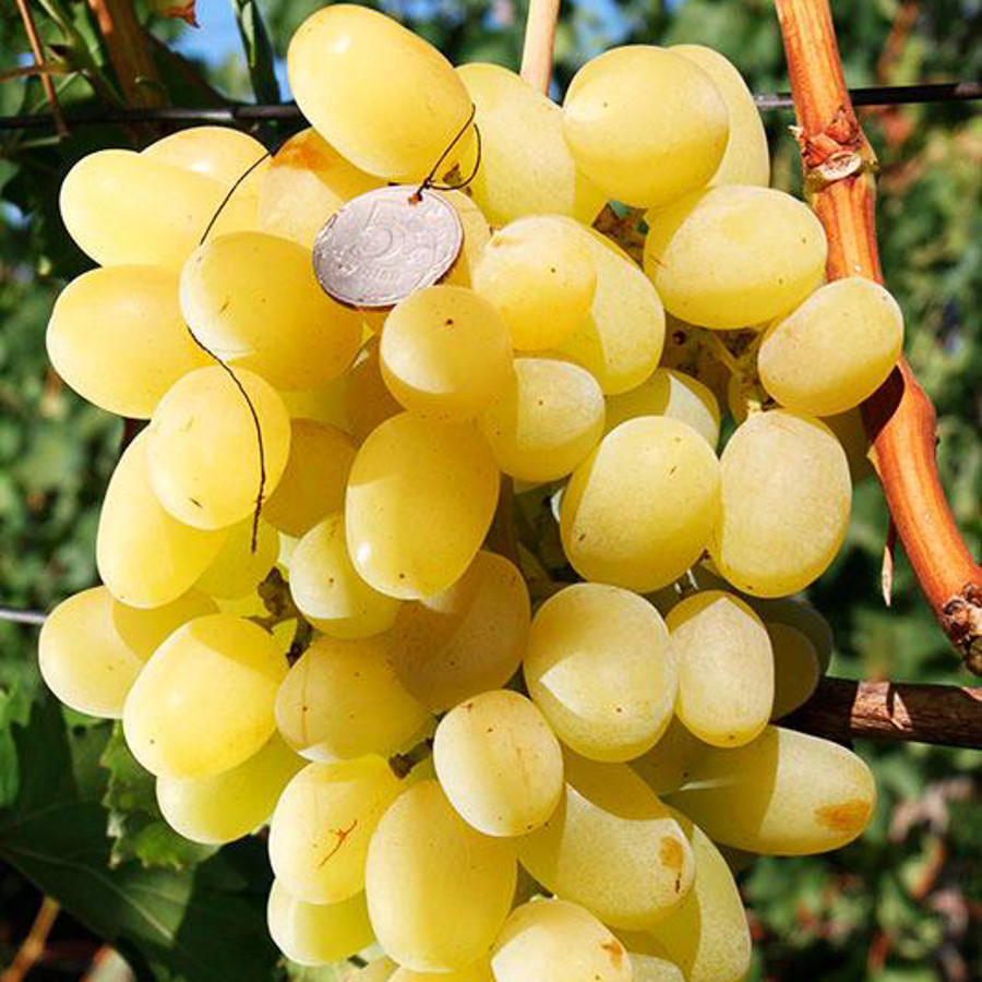 Виноградные кисти данной гибридной формы очень привлекательны, поскольку имеют практически правильную форму вытянутого конуса - цилиндроконические или удлиненно-конические. При этом, по структуре они умеренно-рыхлые, с достаточно большим количеством ягоды. Вес одной грозди в среднем составляет около 0,5 килограмма, хотя чаще встречаются более крупные. Ягоды «Ландыша» имеют удлиненно-овально-цилиндрическую форму, которая встречается только у этой формы. Также, их характерной особенностью является немного заостренный кончик. По своим размерам ягоды могут быть не просто крупными, а даже очень крупными. Средние значения их параметров равны 3,6х2,2 сантиметра. При этом, средняя масса одной виноградины может составлять до 14 грамм. Внешне эти ягоды также очень сильно отличает желто-лимонный окрас кожицы. Но самым главным достоинством и отличием этого винограда является вкус и аромат мякоти. Ведь, очень сладкие ягоды имеют очень стойкий и приятный привкус мускатного ореха, который очень гармонично сочетается с ароматом цветов ландыша и белой акации. Очень важно, что привкус муската в ягодах остается неизменным даже при выращивании его на разных почвах и в разных регионах территории Украины. Также, что касается вкуса, следует обратить внимание на мясисто-сочную структуру мякоти, которая придаем ягодам особенной нежности. А вот о сладости плодов «Ландыша» ярко засвидетельствует показатель сахаристости мякоти: около 17-19% при показателях уровня кислотности всего в 5-7г/л. Кожица у этих ягод хотя и достаточно плотная по своей структуре, но в еде практически не ощущается.