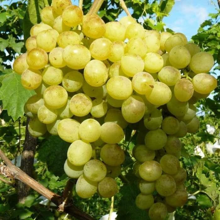 Виноград Восторг Очень раннего срока созревания 110-115 дней. Морозостойкость до -27С. Гроздь средняя и большая, цилиндро-коническая, средней плотности, реже рыхлая, массой 350-500 г. Ягода крупная, 4,5-5,2 г, овальная. Мякоть плотная, мясистая, вкус мускатный. Сахаристость 18-20 %, кислотность 5-6 г/л .Вызревание побегов хорошее. Устойчив к милдью, серой гнили. Транспортабельность хорошая.